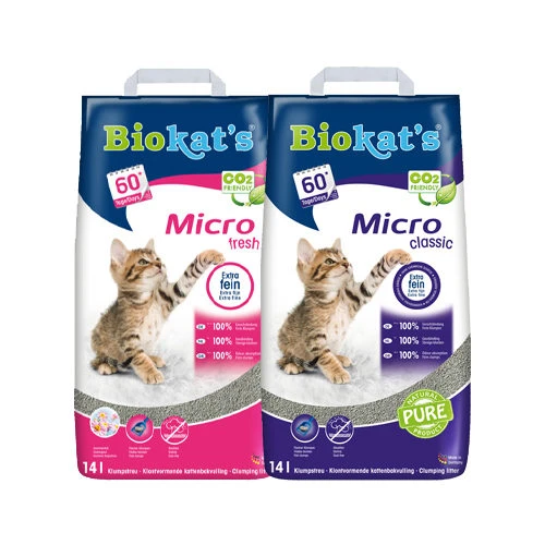 Biokat’s Micro is a very fine grain natural clay grain that absorbs well. The litter is virtually dust free and odourless. Thanks to the fine grain this grit is ideal for use with mesh bottomed litter boxes. The natural clay absorbs urine fast and forms solid clumps that can be easily scooped out. Biokat’s Micro is an efficient cat litter; 1 litre of Biokat’s Micro binds at least 3 litres of liquid. Removing clumps daily makes one bag last longer.
